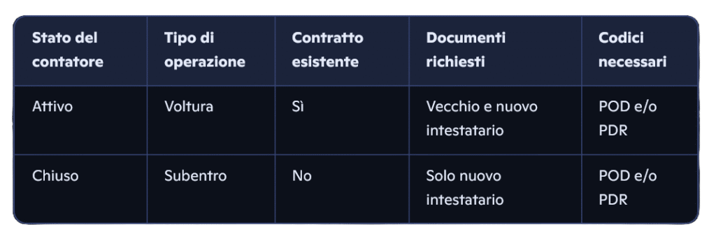 Le operazioni di voltura e subentro prevedono costi simili, con alcune differenze legate allo stato del contatore e al tipo di mercato.